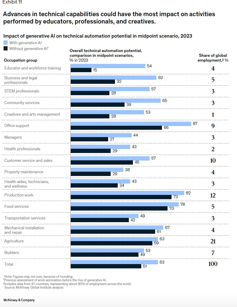 然而,由於生成式 AI 在技術自動化方面的進步,這些以前被認為相對不容易被自動化的工作將收到最大的影響。