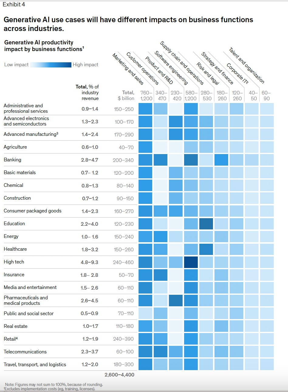 麥肯錫在報告中指出,他們的研究涵蓋了 16 個業務內容並得出結論:如果在各行業中應用,每年貢獻 2.6 萬億至 4.4 萬億美元之間的經濟效益,具體來看: