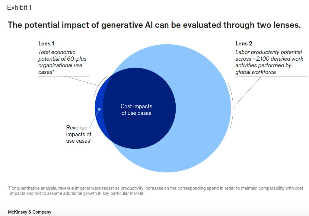 研究主要包括兩個方面:1.60 多個組織使用生成式 AI 後的經濟增長潛力 2.全球約 2100 項工作活動的勞動生產力潛力。
