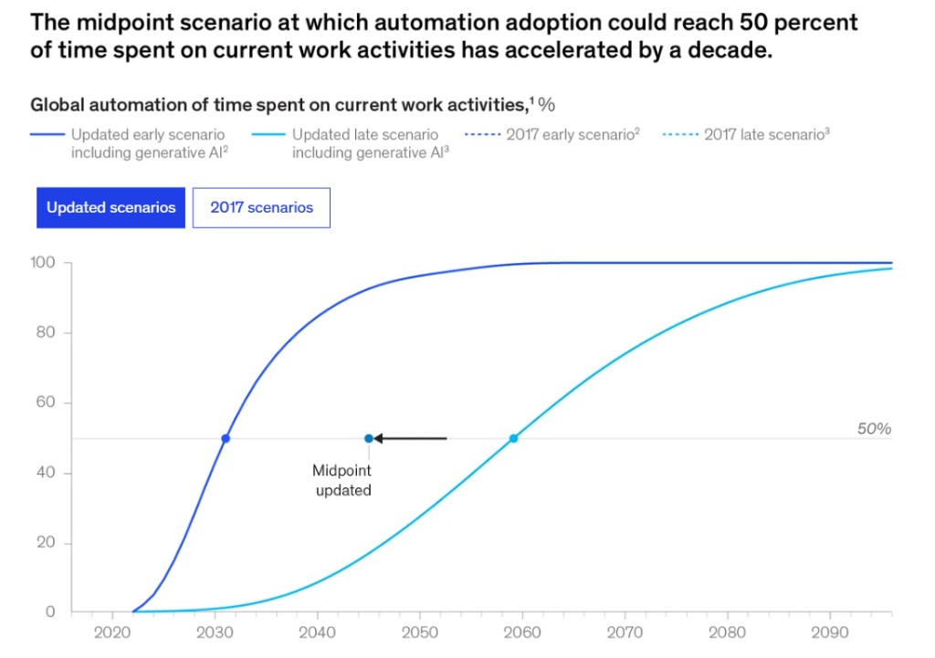 麥肯錫指出,在 2030 年至 2060 年間(中點為 2045 年)50% 的職業逐步被 AI 取代,比他們此前研究大幅提前了 10 年。