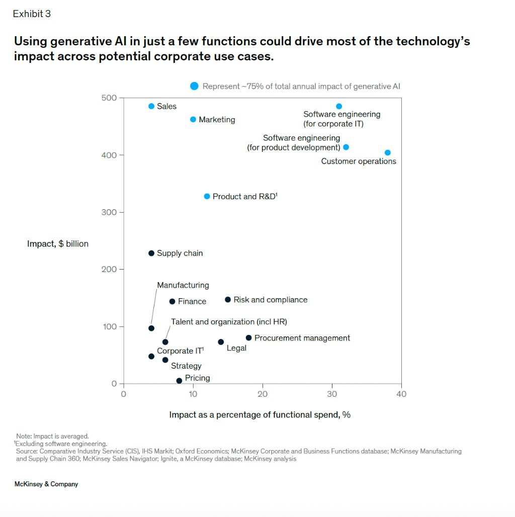 - 生成式 AI 帶來的價值增長,主要(約 75%)集中在四個領域:客户運營、營銷和銷售、軟件工程和研發,這也意味着四項業務受生成式 AI 影響最大。