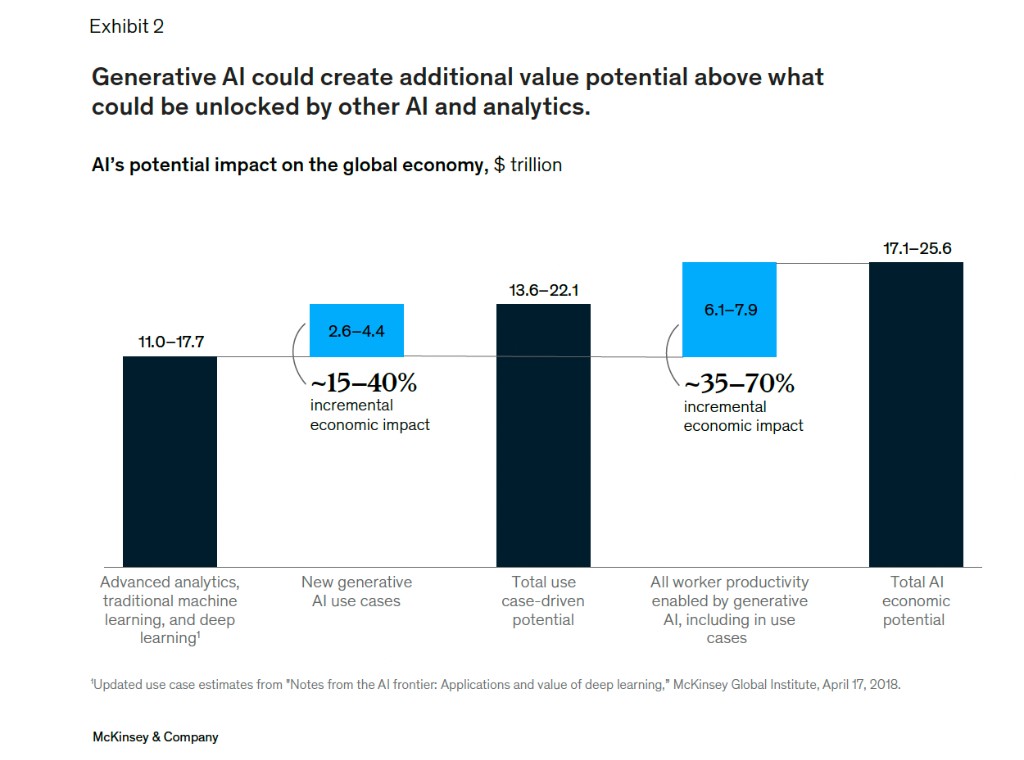 我們估計非生成式 AI 的經濟價值將從 11.0 萬億美元增加至 17.7 萬億美元,增加 15% 到 40%。(2017 年時我們認為人工智能可以帶來 9.5 萬億美元到 15.4 萬億美元的經濟價值)