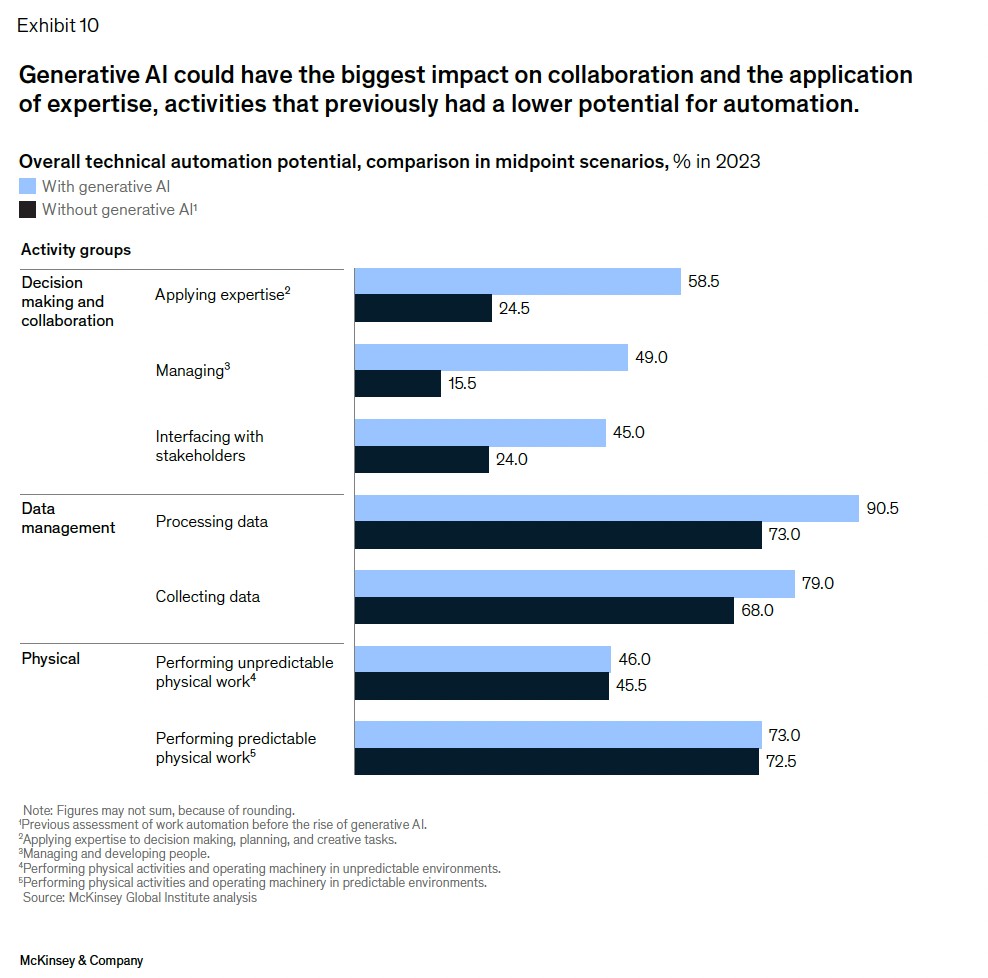 前幾代的自動化技術主要是涉及數據收集與處理,因此對於知識工作者的影響較小,但生成式 AI 的出現,使得 “知識工作者” 的角色和任務與大語言模型(LLM)正好適配。因為大語言模型從根本上是為了完成認知任務而設計的,因此我們對大語言模型在專業知識的應用能力較 2017 年增加 34 個百分點,而自動化管理和培養人才的潛力從 2017 年的 16% 上升到 2023 年的 49%。