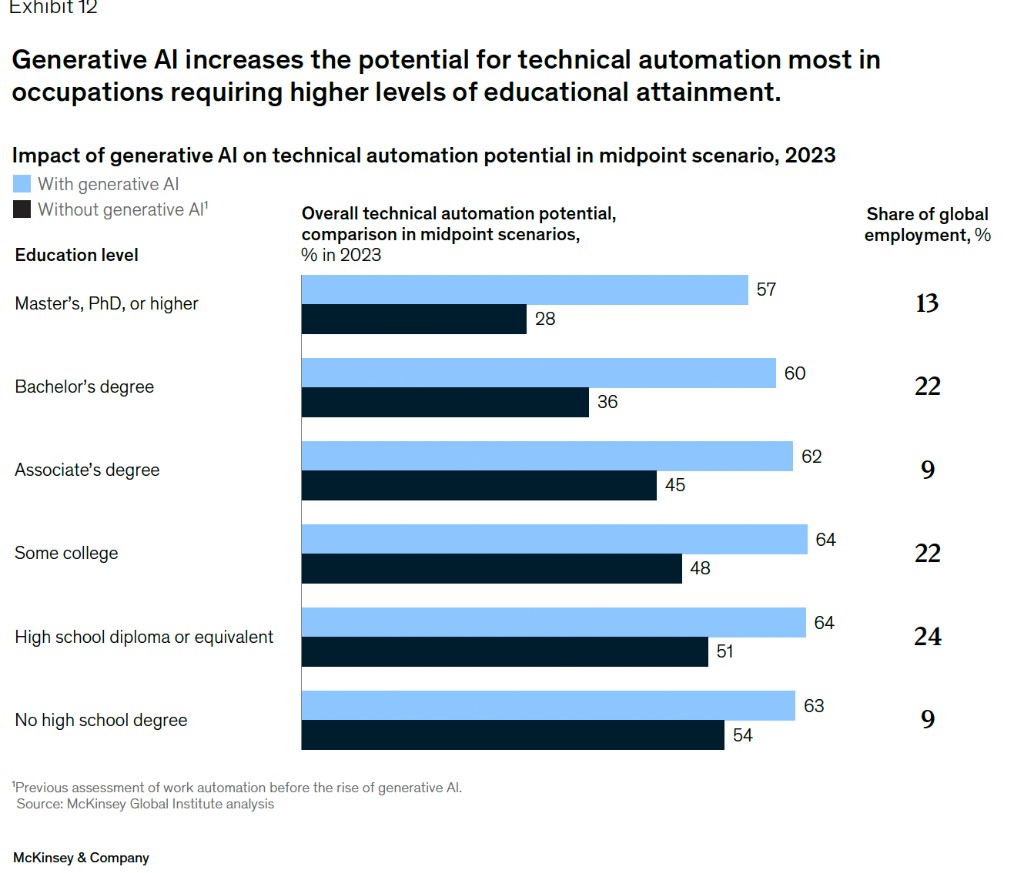 與此同時,麥肯錫指出,此前的眾多生產力變革中,擁有高學歷的人往往受到的影響較小,但AI 的革命將會使高學歷的人才受到更大影響: