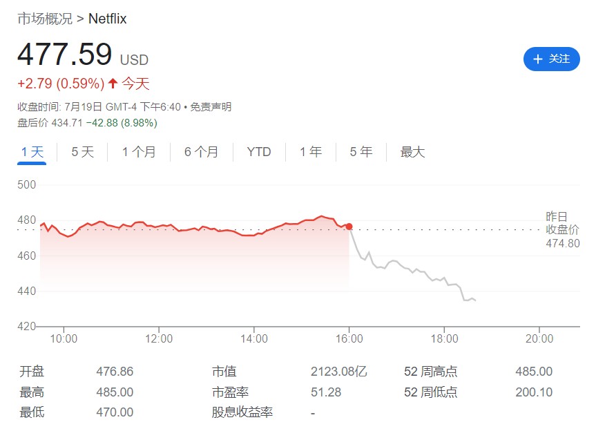 由於二季度的營收和三季度業績指引遜於市場預期,奈飛股價在盤後跌 9%。今年以來,該公司股價已經上漲了 62%。