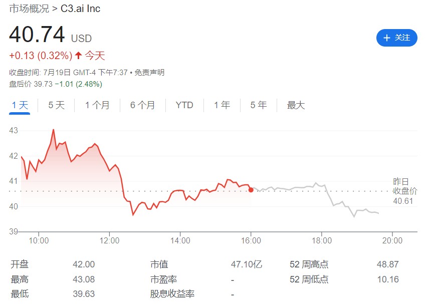 另一家 AI 概念股 C3.AI 盤後跌約 2.5%。