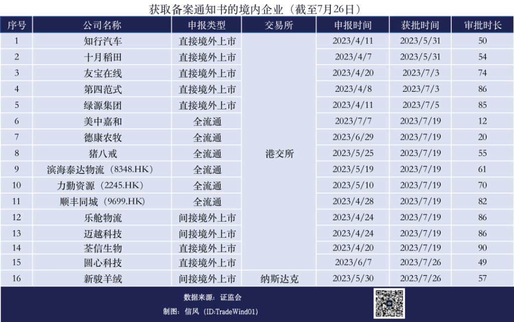但在昨晚(7 月 26 日)之前,只有擬/已登陸港交所的 14 家中企收到了證監會的備案通知書。其中歷時最長的是江蘇荃信生物醫藥股份有限公司,從 4 月 20 日遞交備案資料到 7 月 19 日通過備案,歷時 90 天。