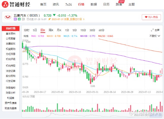 An earnings forecast has once again caused a stir in the stock price of Wuling Motors (00305). At the close on July 27th, the company's stock price was HKD 0.73, touching the 60-day moving average. So far, the stock price has been declining for about 5 months from its peak of HKD 1.077, and the bottom turning point seems to be yet to appear.