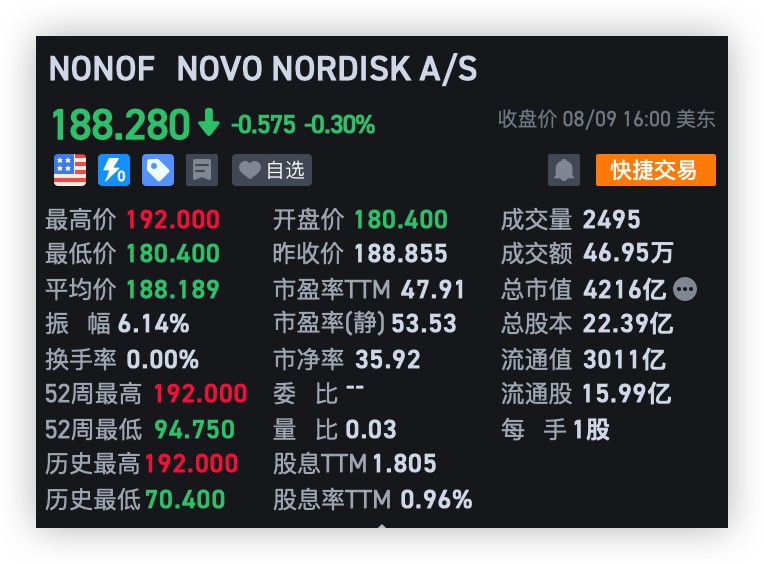 Since the end of 2018, Novo Nordisk's stock price has more than tripled, with a current market value of around $420 billion, surpassing Denmark's GDP and gradually approaching luxury goods giant LVMH Group, with the potential to become the highest-valued company in Europe.