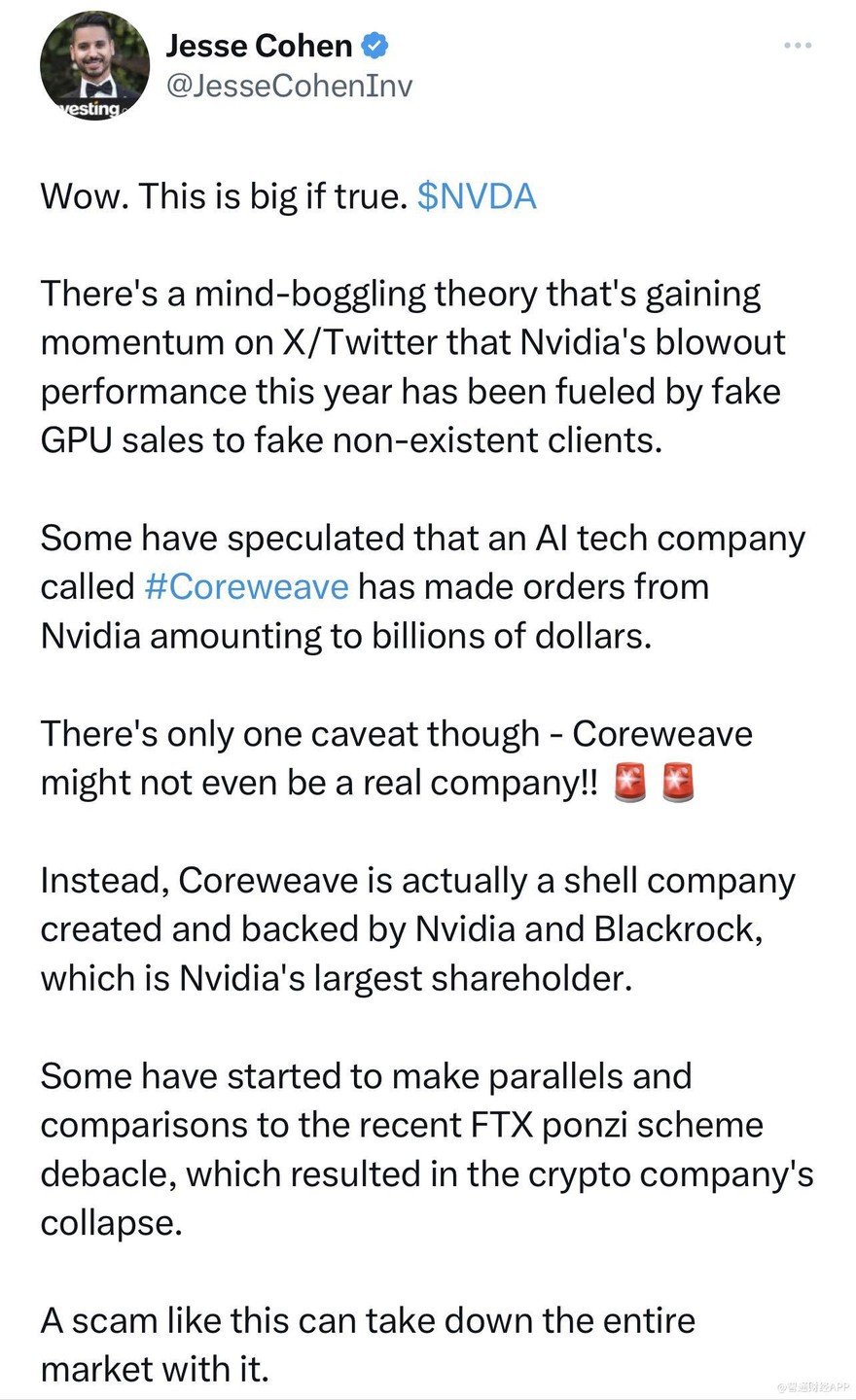 According to Dolphin Research APP, recently, someone posted on social media claiming that the market demand for NVIDIA (NVDA.US) chips is false, and there are companies colluding with NVIDIA to manipulate revenue.