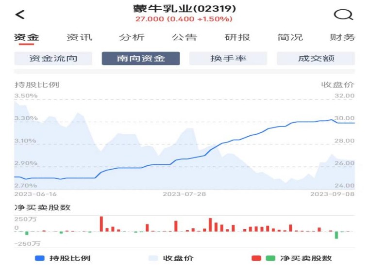 智通財經 APP 數據顯示,截至 9 月 7 日的近 60 個交易日,蒙牛獲得 12.28 億港元資金淨流入。南向資金自 7 月初以來持續增持蒙牛股票,其持股數量由 7 月 5 日的 1.11 億股,增加至 9 月 8 日的 1.3 億股,增幅達到 17.1%,足見投資者對蒙牛中期業績及長期發展前景的認可。
