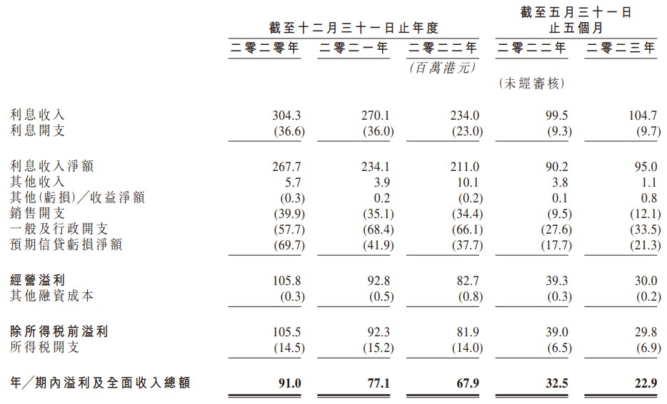 As of December 31, 2020, 2021, 2022, and May 31, 2023, K Cash Financial Technology's outstanding loans were HKD 986 million, HKD 845 million, HKD 914 million, and HKD 948 million respectively. In terms of finance, for the five months ending on May 31, 2020, 2021, 2022, and 2023, K Cash Financial Technology achieved interest income of HKD 304 million, HKD 270 million, HKD 234 million, and HKD 105 million, respectively. The net interest income was HKD 268 million, HKD 234 million, HKD 211 million, and HKD 95 million, respectively. During the same period, the total profit and comprehensive income amounted to HKD 91 million, HKD 77.1 million, HKD 67.9 million, and HKD 22.9 million.