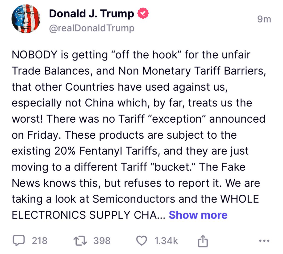 Trump just clarified: semiconductors, computers, and smartphones are moving into a new 20% tariff bucket, not exempt, just reclassified. That’s steep, but still far below the 145%+ tariffs some smaller importers face.Still very bullish on AAPL, NVDA, TSMC. They’ve got the scale and supply chain flexibility. But for small businesses, this will be devastating.The copyright of this article belongs to the original author/organization.