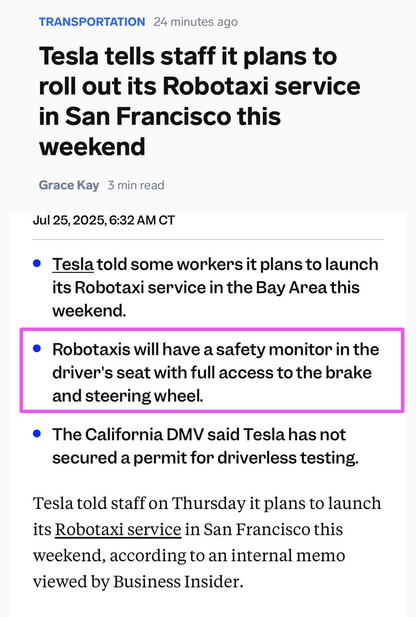$Tesla(TSLA.US) plans to roll out supervised robotaxi in San Francisco this weekend.