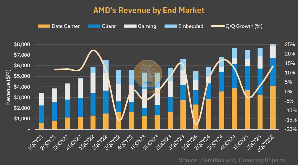- Revenue up 3% q/q and 32% y/y to $7.7 (above mid pt guidance)- Except DC, all end markets up q/q in QJun- All-time-high quarter for PC CPU and server CPU- Export controls affected DC GPU sales; down y/y and q/q- DC revenue down 12% q/q and up 14% y/y to $3.2B; incremental revenue driven by server CPU; momentum in Cloud and Enterprise segments- Strong DD% q/q DC growth in QSep- MI35x launch and broad adoption; Oracle 27k MI355 cluster- MI400 on track for 2026 launch; high customer interest, large scale deployments; rack-scale (Helios); 72 GPU- MI308 will ship once licenses approved; 3Q guidance excludes MI308 revenue- DC GPU will resume y/y and growth in 3Q and will grow in 4Q as well- 40+ sovereign engagements- Sees a path to tens of billions of dollars of DC GPU revenue; contingent on gigawatt DCs- DC GPU still below corporate average GM; but expects it to grow over time as revenue grows and operational efficiencies kick in- MI355 to ramp quicker than MI300- MI355/400 lead times 8-9 monthsSource: Sravan Kundojjala
