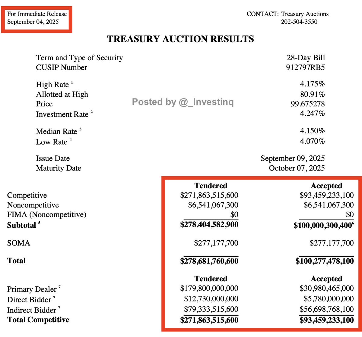 🚨 The U.S. just sold $100 billion in 4-week Treasury bills.