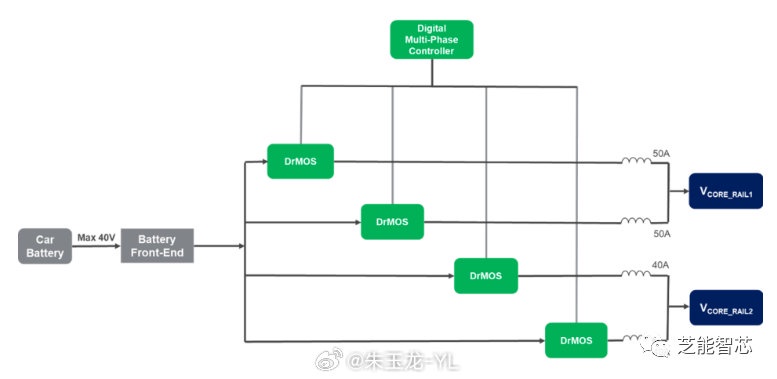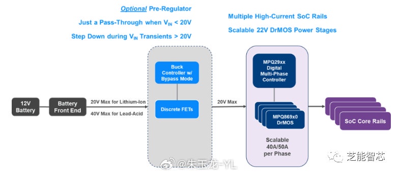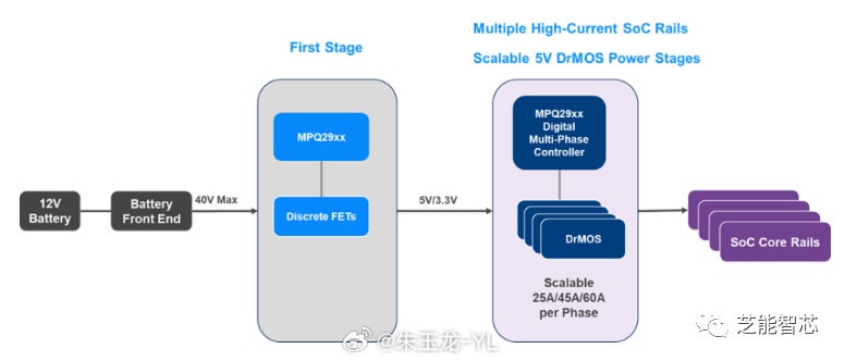 DrMOS 是一种单片电源设计,具有高功率密度、精确的电流感应和精确的芯片内温度感应,数字控制器提供了灵活性和可扩展性,可以根据给定 SoC 核心轨道的电流等级配置相数。数字控制器不需要任何外部反馈环路补偿,这简化了设计工作,缩短了开发时间。DrMOS 还具有非易失性内存(NVM),可以配置和重新配置寄存器设置,最多可达 1,000 次,控制器和 DrMOS 提供了各种监测和保护功能,可用于实施系统级遥测。汽车 SoC 和电池现代汽车有两种 12V 电池选择:铅酸电池或锂离子电池。锂离子电池的最大输出电压(VOUT)高达 20V,铅酸电池在瞬态时可以达到 40V 的最大 VOUT。使用 22V 额定 DrMOS 产品的单级电源转换实现,锂离子 12V 电池的车辆可以直接在电池上使用 22V 的 DrMOS,而无需预调节器将电池电压转换为 SoC 核心轨道电压。这对于提高效率、减小 PCB 面积、降低成本和优化电气性能是一种理想的实现。对于使用铅酸电池的车辆,在负载转储或双电池情况下,最大电压可能达到 40V。在这种情况下,将使用预调节器来限制 DrMOS 上的输入电压(VIN)的最大值为 20V,以保护 DrMOS 在瞬态时期。可以使用预调节器作为电压限制器。该预调节器可以以 100% 占空比运行,在正常工作条件下,它只是一个提供>99% 效率的传递,这意味着在电池电压(VBATT)超过预设 20V 限制时,预调节器在电压瞬变时限制 DrMOS 的 VIN 为 20V 的几毫秒。在电气性能方面,使用预调节器的实现与单级电源转换类似,因为预调节器仅在 VBATT 瞬变超过 20V 时的瞬态期间处于活动状态。此外,在具有预调节器的情况下,总 PCB 面积仍然可以小于传统实现,后者使用高电压离散 FET 和模拟 PWM 控制器进行单级转换。使用两级电源转换的 12V 铅酸电池供电汽车应用的实现,第一级将 VBATT 转换为 5V 或 3.3V 的中间总线电压。第二级将中间总线电压转换为 SoC 核心轨道电压,使用 6V 额定 DrMOS 设备。两级转换需要额外的半导体器件,但与单级解决方案相比,对于低至中功率 SoC 核心轨道来说,总体 SoC 电源解决方案可能更小、更便宜。系统设计师必须权衡所有因素,例如 12V 电池化学成分和 SoC 核心轨道功率规格,以选择设计的最佳电源架构。使用数字多相控制器和单片式 DrMOS 功率级的简化应用原理图。MPQ2977-AEC1 数字,6 相控制器配置为两个输出轨和每个轨的三个相。实施了一些监测和保护功能,例如过电流保护(OCP)、过电压保护(OVP)和过温保护(OTP)。●汽车分布式架构供电汽车计算架构正在从分布式架构演变为由强大的 SoC 驱动的集中式架构。在中央计算中使用的 SoC 需要先进的电源管理解决方案,特别是用于核心电压轨道。传统的电源解决方案不再适用于下一代中央计算功率应用。在汽车 SoC 核心电源应用中使用的电源管理解决方案、数字多相控制器和 DrMOS 功率级可以提供可扩展、灵活、紧凑的高效电源解决方案和快速瞬态响应。本文解释了如何实现具有单级或两级电源转换的电源架构。The copyright of this article belongs to the original author/organization.