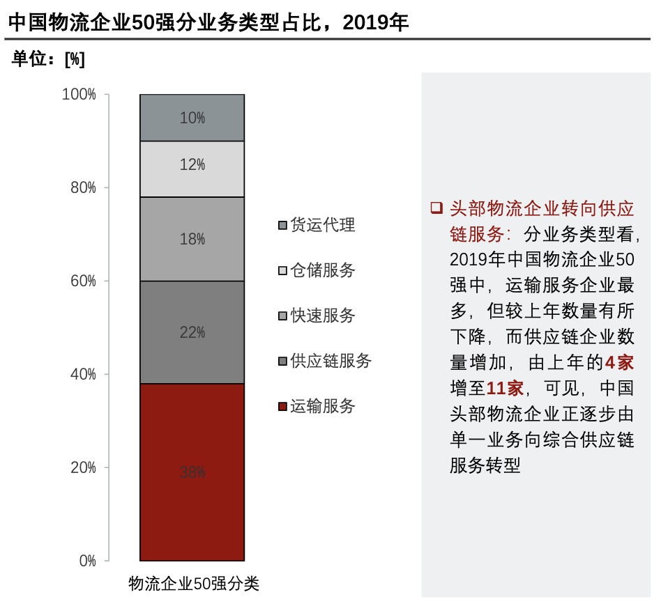 综合服务型物流企业是从事多种物流服务业务,可以为客户提供运输、货运代理、仓储、配送等多种物流服务,具备一定规模的一类物流企业。在我国,公路货运依然是最主要运输方式。同时,各种网络货运平台也在进行 “互联网 + 物流” 的新探索。