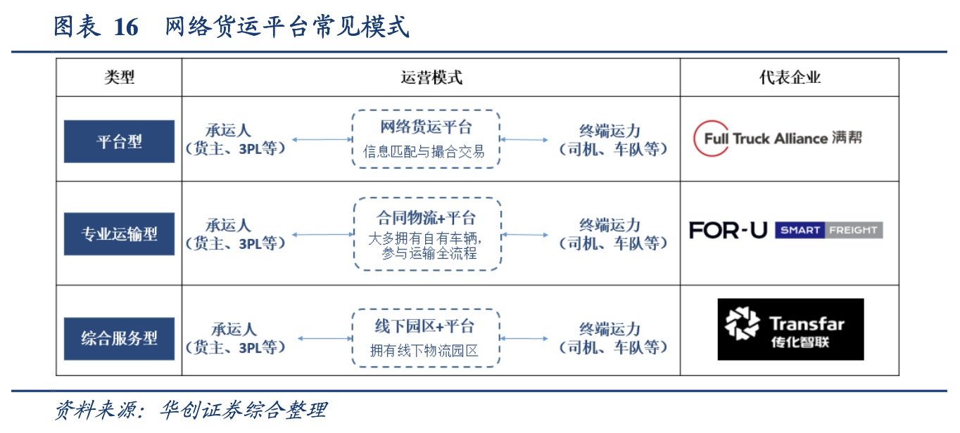 大宗物流和跨境物流运输服务企业物流总量大,但信息化程度不足,如中国外运、联合包裹(UPS);个人消费者更熟悉的综合物流如顺丰控股、京东物流以及 “四通一达”,在网络货运平台的发展方向上不断进阶,前者定位为综合物流服务商,后者定位为供应链解决方案及物流服务商。