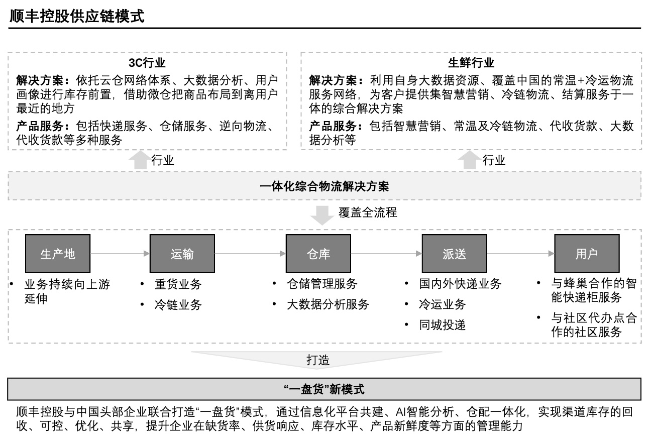 以顺丰物流为例,顺丰的供应链业务主要针对高价值的 B 端企业,服务涉及企业的原材料采购、储存、产成品制造与销售等环节,已与 3C、生鲜、服装、汽配、医药等领域的头部企业形成良好合作关系,同时与快运等其他业务形成联动。顺丰控股在用户资源(优质 B 端用户众多)、自身物流资源(“天网 + 地网 + 信息网” 的时效优势突出)、物流版图完整度等方面,优于其它物流企业,已形成较强的护城河。