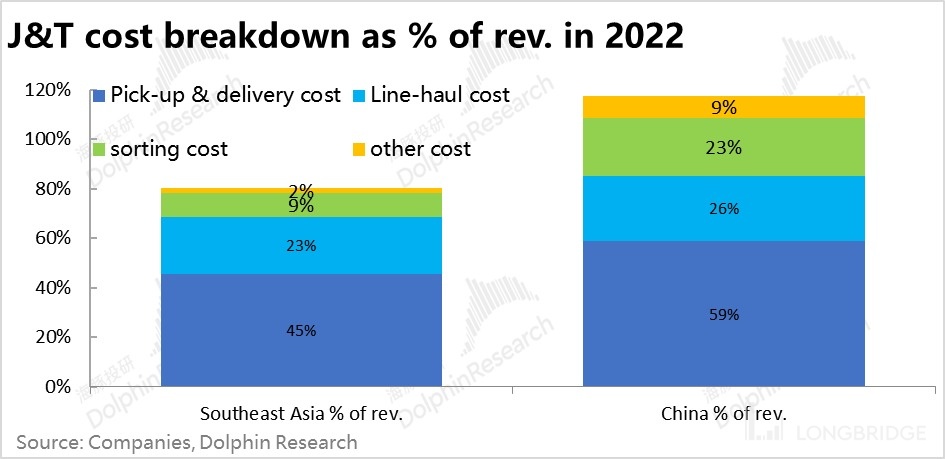 So why is there such a huge difference in profitability for the same J&T in two different markets? First of all, from the perspective of financial/operational data, the significantly higher average package price in both markets is a natural reason. However, from the perspective of relative operational efficiency (represented by the proportion of average transportation costs to average revenue), the cost items of J&T in Southeast Asia (delivery, sorting, trunk transportation, etc.) account for a lower proportion of revenue compared to the domestic market.And from the core business methods/philosophy of the company, what differences have led to the divergent performance of J&T in the two markets? Although Dolphin Research has no first-hand experience of J&T's delivery service in Southeast Asia, according to multiple channel surveys and feedback, J&T's operations in China are similar to Pinduoduo, advocating a rough and rugged style of "just enough" management, but when it first started in Southeast Asia, it was once regarded as the "SF Express of Southeast Asia", emphasizing service quality and meticulous management. Dolphin Research believes that this fundamentally opposite business philosophy is the root cause of the huge performance difference of J&T in the two markets.