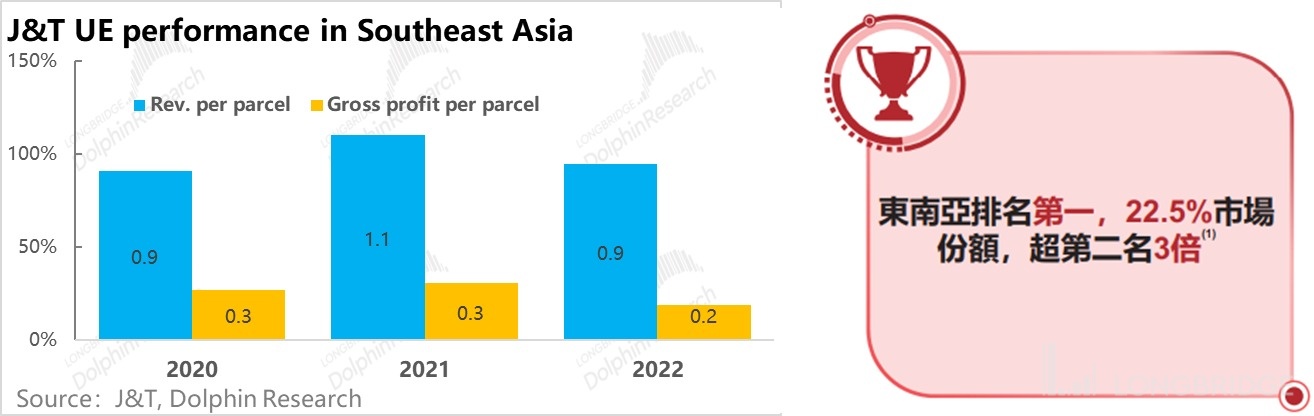 In terms of profitability, compared to the average revenue of $0.3 per order and negative gross profit per order in the domestic market, J&T's average revenue per order in Southeast Asia is close to $1, and the average gross profit per order is $0.2-$0.3. It can be seen that the profitability of J&T's business in Southeast Asia far exceeds that of its domestic business.