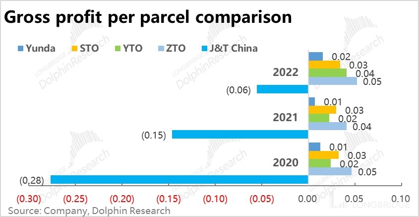 While the average revenue per parcel is lower by 2-3 cents, the average cost is higher by 5-7 cents, resulting in J&T still incurring a loss of approximately 6 cents per parcel in 2022. In comparison, Yunda Express, which has the thinnest profit margin in the industry, has a gross profit of 2 cents per parcel. It can be seen that J&T still has a significant gap in operational efficiency and cost control in terms of "internal strength".