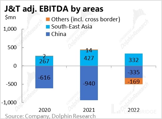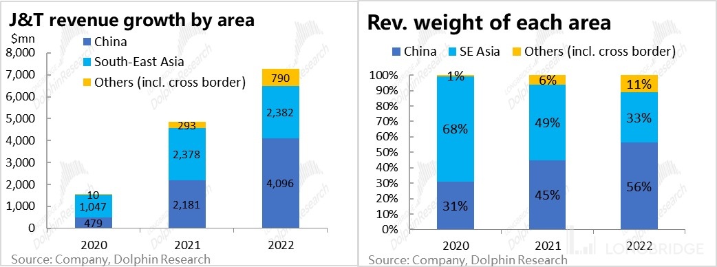 Therefore, Dolphin Research believes that when evaluating J&T's valuation in the future, the Southeast Asian business should be considered as the cornerstone, while the Chinese and overseas businesses represent the upward potential and room for imagination. The following analysis of J&T will focus on the two major segments: domestic and Southeast Asian markets.