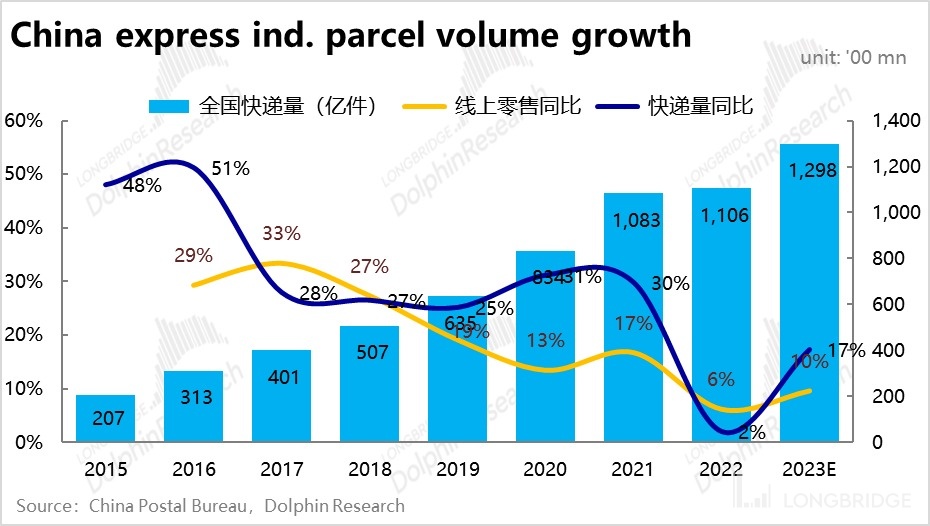 In general, the development of the domestic express delivery industry is closely tied to the rise and fall of the e-commerce industry. It is estimated that in 2022, out of the total of over 100 billion express parcels in China, about 90% are related to e-commerce. It can be said that the domestic express delivery industry mainly serves the fulfillment needs of e-commerce. Therefore, the demand for express delivery is generally consistent with the growth trend of online retail sales.