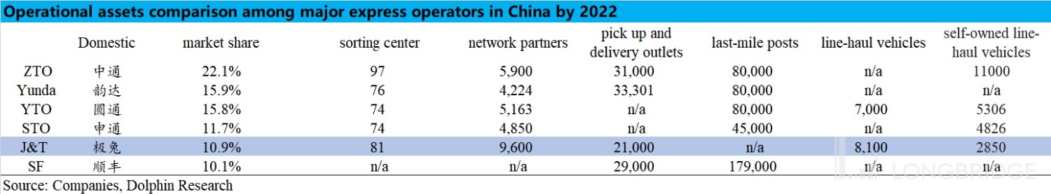 In terms of fixed assets, looking at the number of sorting centers, trunk vehicles, and end stores, J&T is on par with other leading players, without any significant advantages or weaknesses.