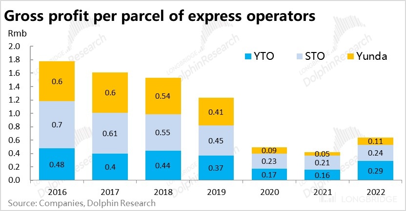 The intense competition within the industry is the fundamental reason for the decline in unit price, which has also resulted in a continuous decrease in gross profit per package despite the continuous growth in package volume for each express delivery company in recent years, indicating an uneconomical scale.