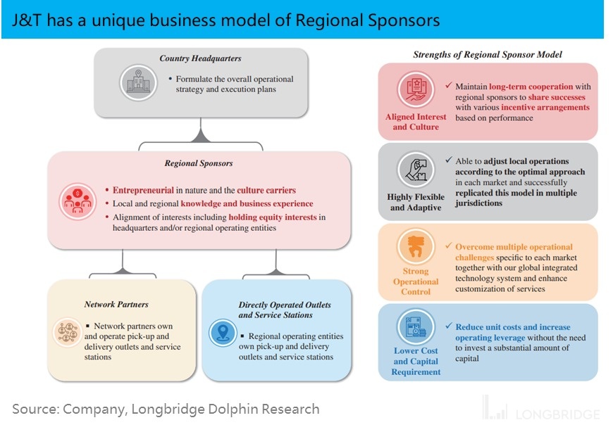 Unique three-tier franchise model conducive to rapid expansion: Unlike the common two-tier franchise system (headquarters and franchisees) adopted by domestic industry leaders such as Shunfeng, J&T employs a unique three-tier franchise system consisting of the national headquarters, regional partners, and terminal franchise stores. The main difference is that J&T has an additional layer of regional partners.