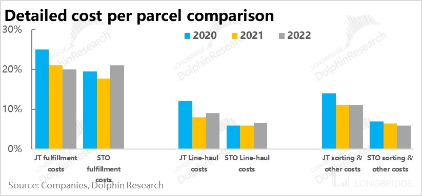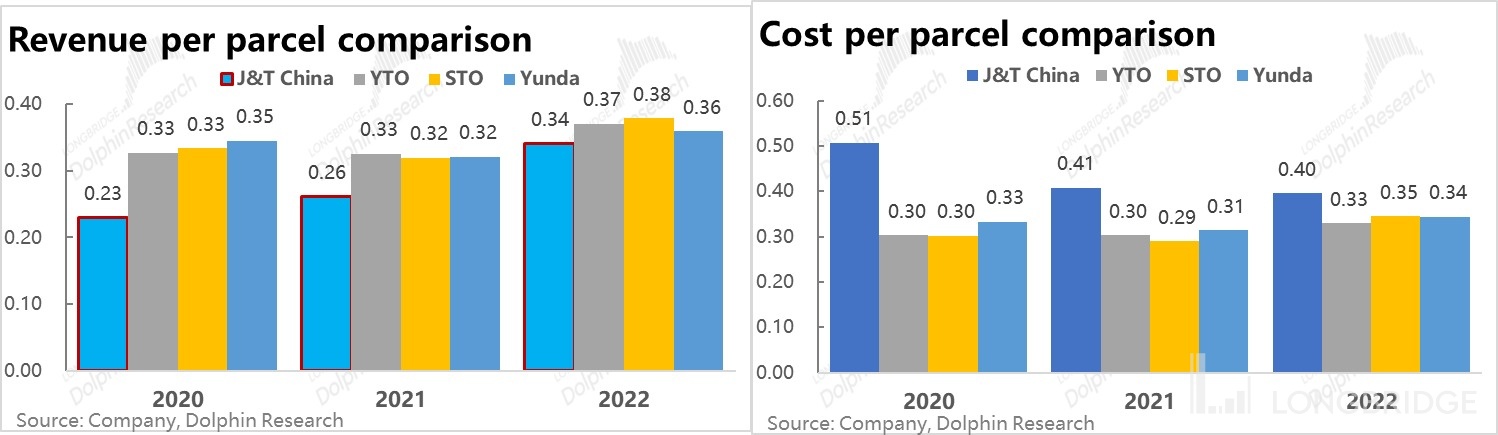 ④ In terms of average cost per parcel, from 2020 to 2022, although J&T's average cost per parcel decreased from $0.5 to $0.4, it is still $0.05-$0.07 higher than its counterparts.