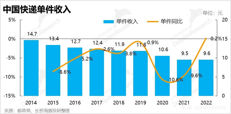 In addition to the limited overall growth rate of the industry, another significant pain point in the express delivery industry is the oversupply of transportation capacity, which has led to intense competition within the industry. As shown in the graph below, the average price of express delivery in China has been declining since 2014, from a peak of 14.7 yuan per package to only 9.6 yuan in 2022, a decrease of nearly 35%. The downward trend in the average price of express delivery can be attributed to the economies of scale brought about by the industry's expansion and the efficiency improvements resulting from management and technological advancements. However, the oversupply and intense competition in the domestic express delivery market are the key reasons for the continuous decline in unit price.