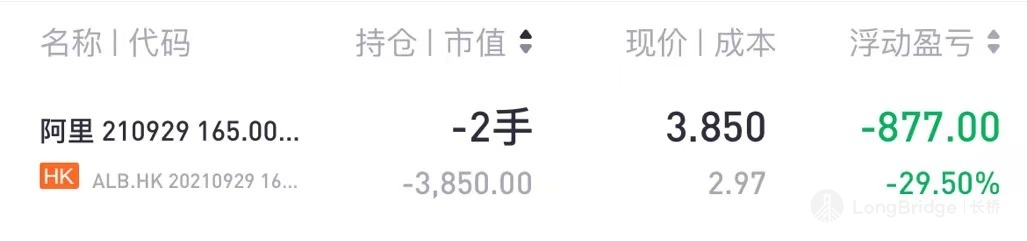 看完上面卖 Put 的讲解,这个阿里的 PUT 大家估计也就能看懂了。交割日 9 月 29 日,行权购买价 165 港币,数量 2 收(1000 股),期权价格 2.97 港币。简单说要么白捡 2970 港币,要么 165 港币(4500 亿美金估值)买入阿里 1000 股。