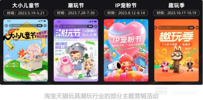 平台还在儿童节、暑假等特定时间节点开展了 “大小儿童节”、“潮玩节”、“趣玩季” 等面对不同品类、圈层的营销活动。12 月份,淘宝天猫平台或将发布年度 IP 大赏,继续推动 IP 圈层热潮。