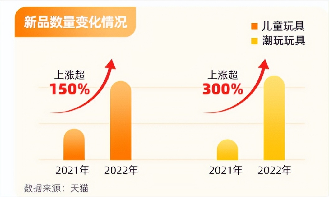 一是新品成为天猫潮玩商家增长 “奇点”。2022 年,天猫儿童玩具、潮玩新品数量分别同比前一年增长 150% 和 300%。天猫平台的爆款新品也层出不穷,2022 年 “千万新品” 超 70 款。