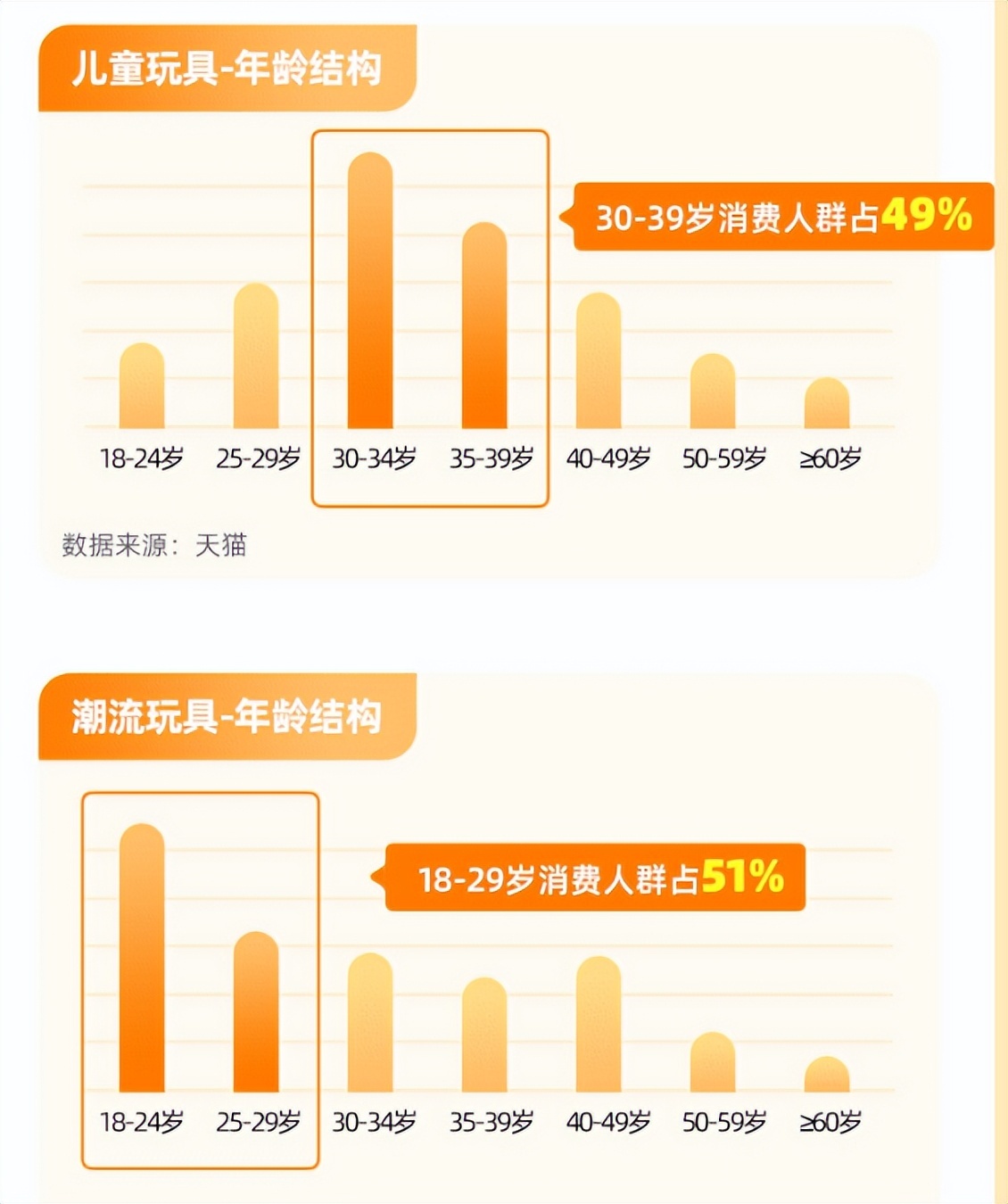 儿童玩具消费者集中于 30-39 岁,潮玩主流消费者更加年轻,只有 18-29 岁,淘宝天猫将潮玩产品分为母婴/低幼儿童玩具、年轻消费者偏爱的潮流玩具、年长消费者喜爱的收藏玩具三类运营。