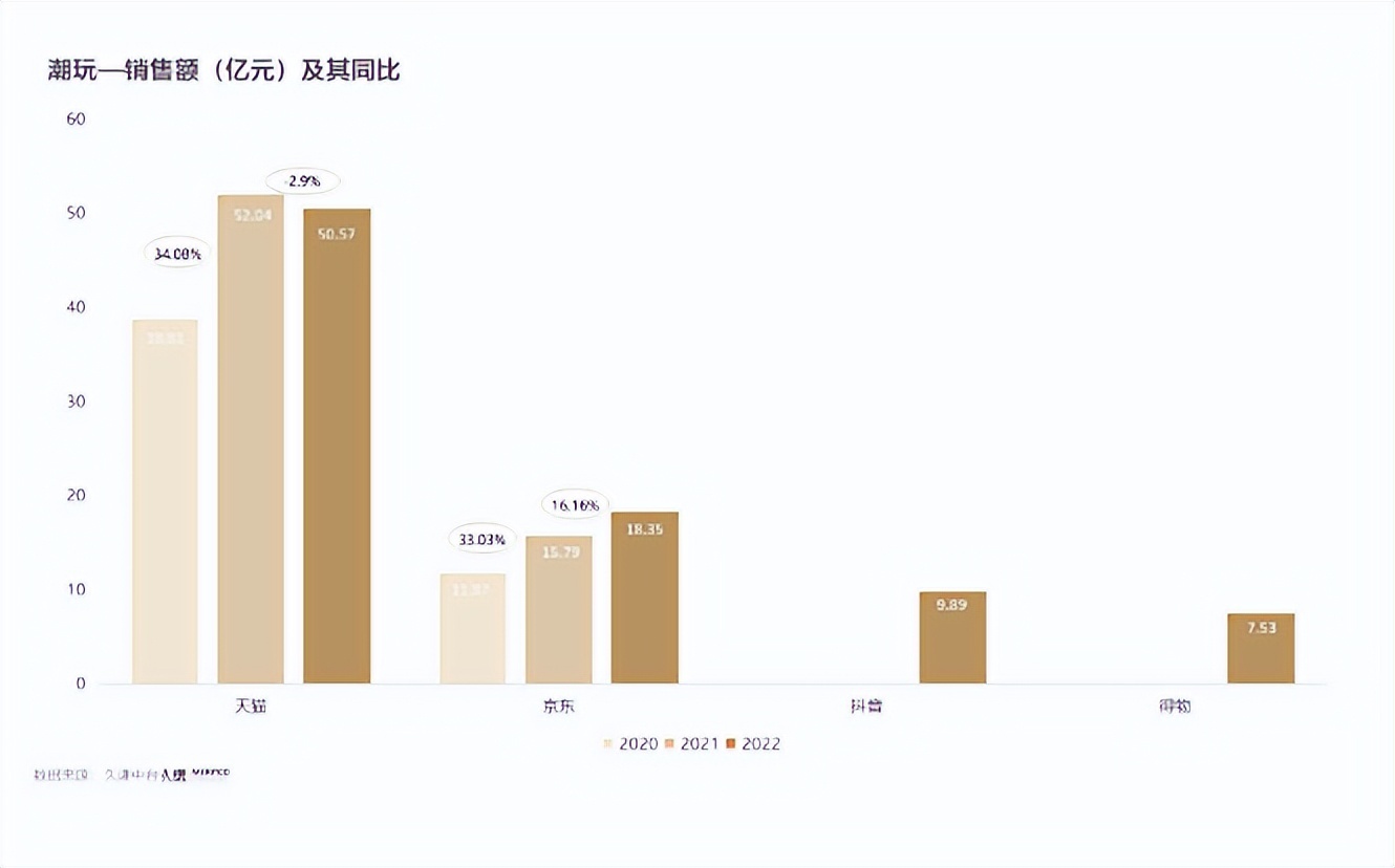 统计数据显示,2020-2022 年,天猫平台潮玩品类 GMV 远高于京东、抖音平台,是国内电商中潮玩垂类 GMV 最大的平台。