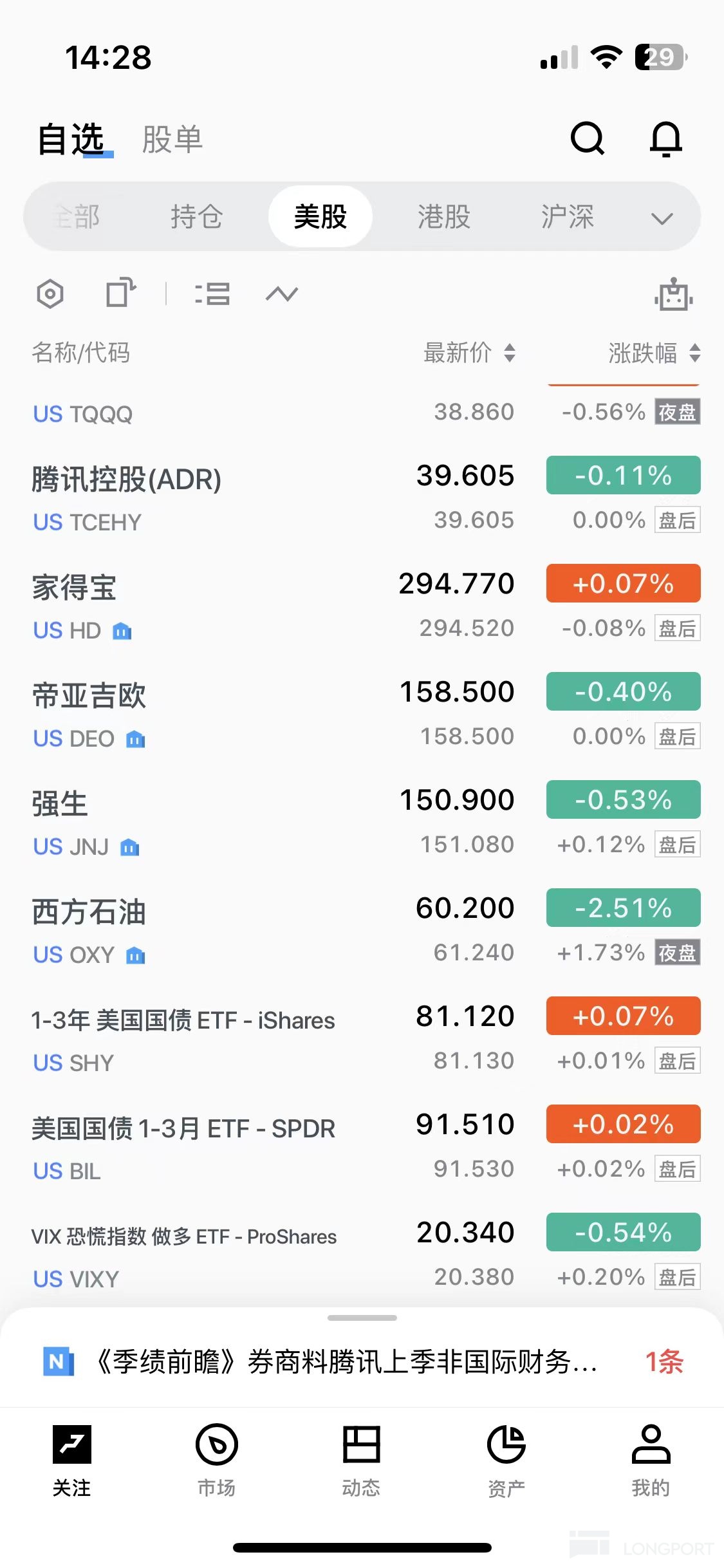 但是,一些交易热度没那么高的标的,比如我持有的帝亚吉欧、家得宝、强生等,就没有此权限,只显示上一个交易日的盘后价。