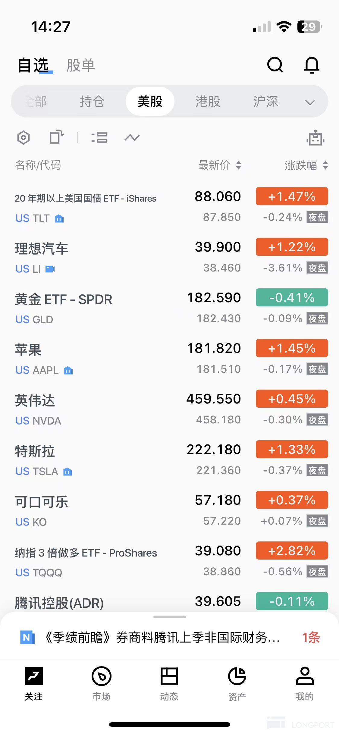 以我的自选股为例,可以看到比较热门的标的,基本都有涵盖的,只要加了关注,标的右下角会有【夜盘】角标,无需我们专门去找。