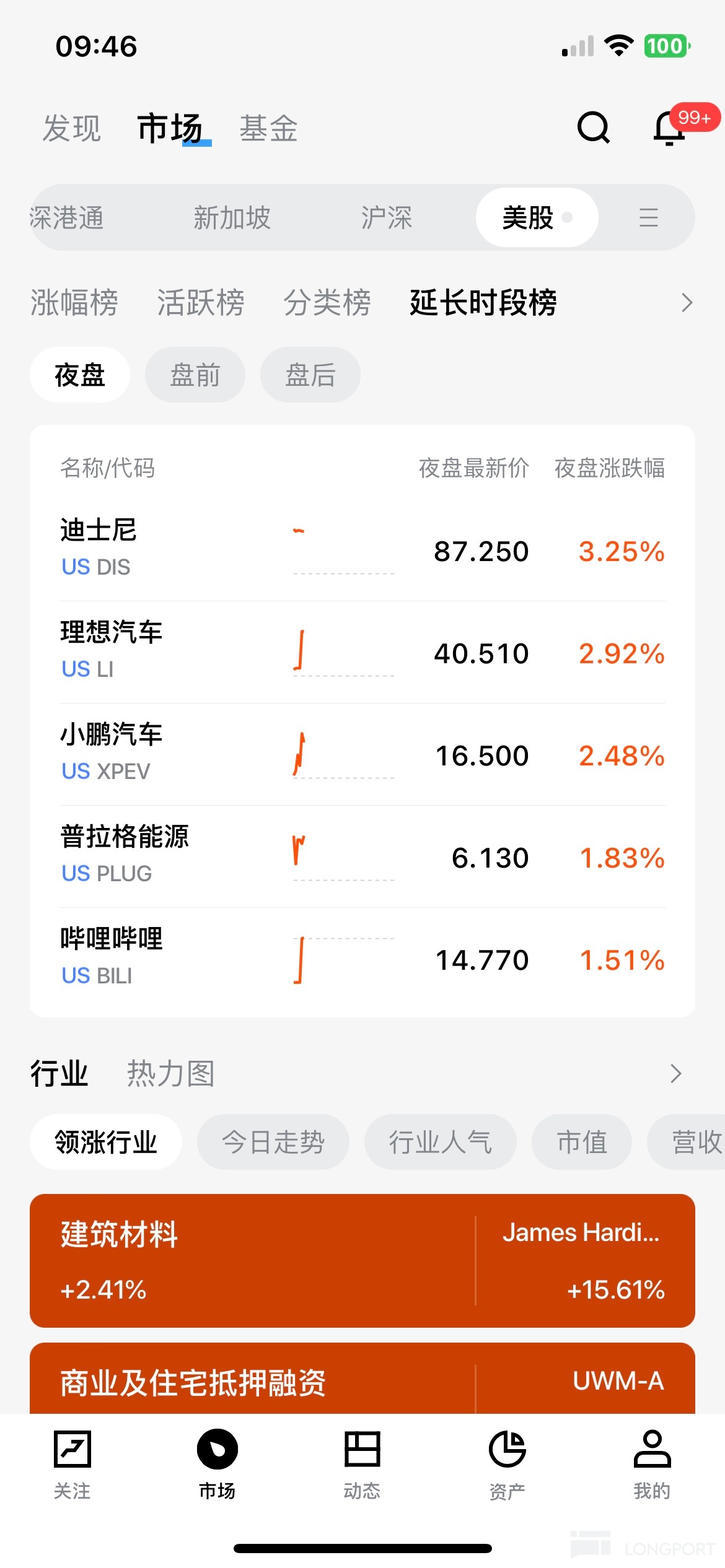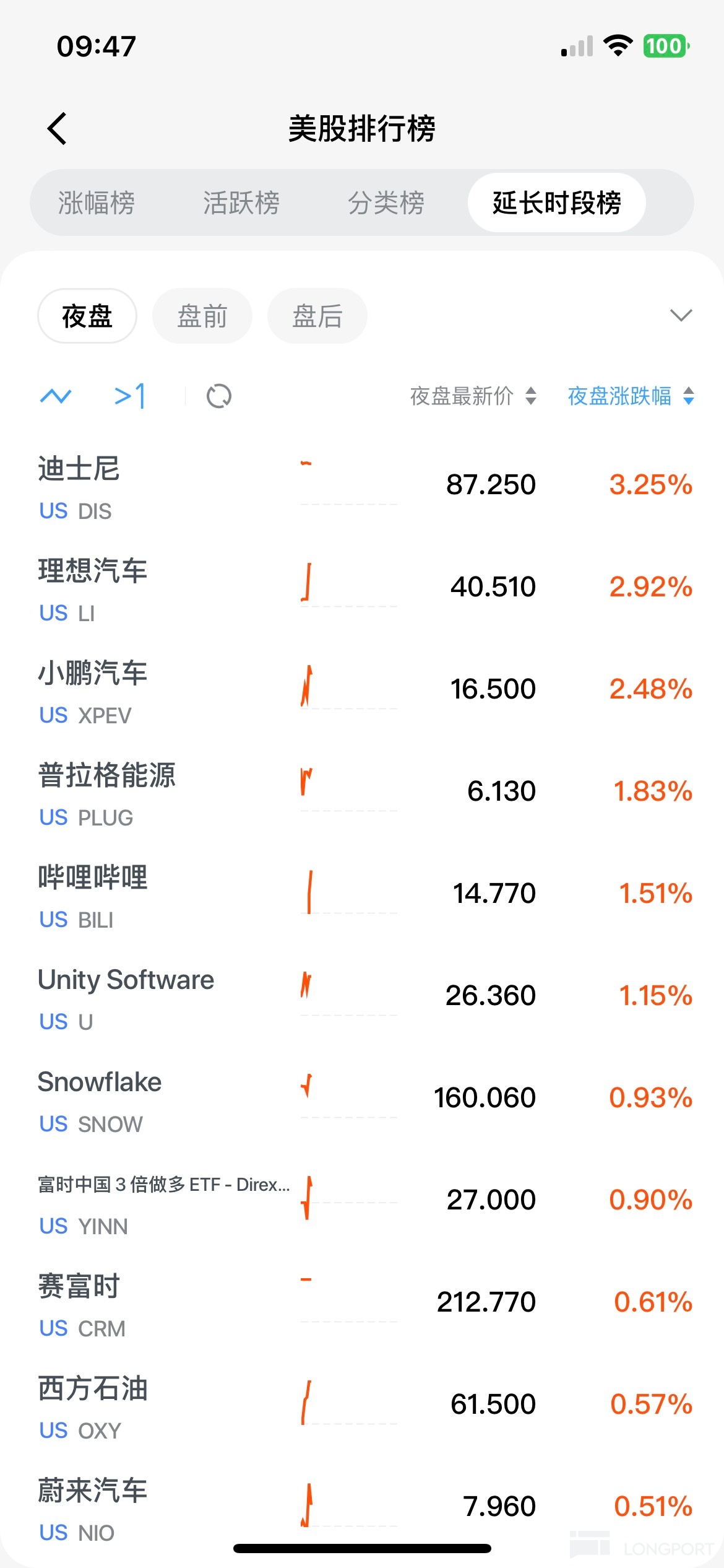 夜盘的整体行情,也可以在 “市场 - 美股 - 延长时段榜” 看到,如图所示: