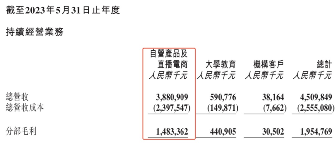 结合东方甄选最新财务数据来看,2023 财年(2022 年 6 月 1 日-2023 年 5 月 31 日)东方甄选自营产品及直播电商业务的总营收 39 亿元,其中自营产品总营收超过 26 亿元,毛利 15 亿元。