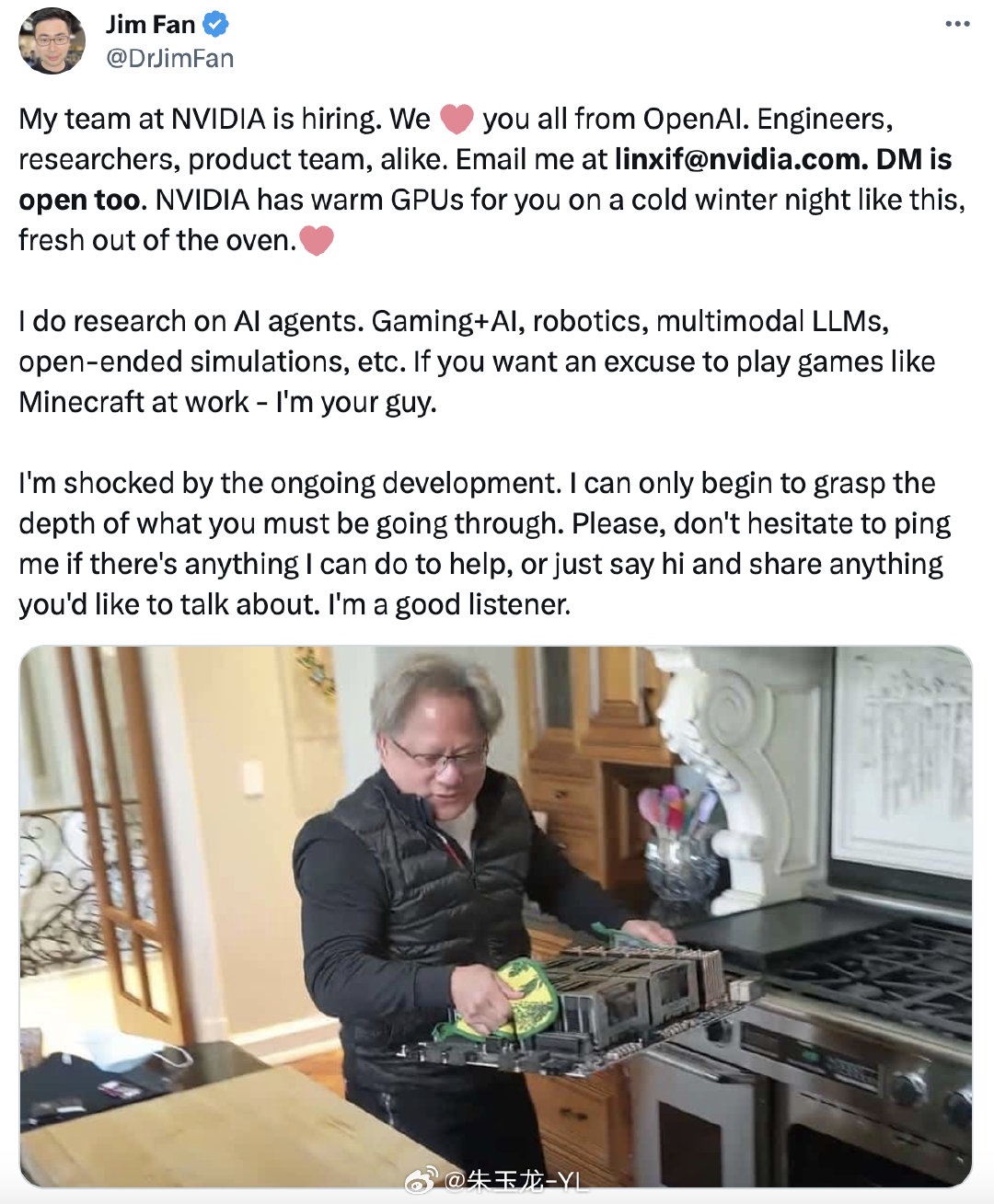 Openai 自毁前程以后,微软把两位当家给留下了。现在英伟达也开始敞开了招聘 Open AI 的人这两家都不缺钱,市值 1 万亿美元以上的公司直接在线上挖人,这哪撑得住啊🤣Openai 是散伙饭的节奏。