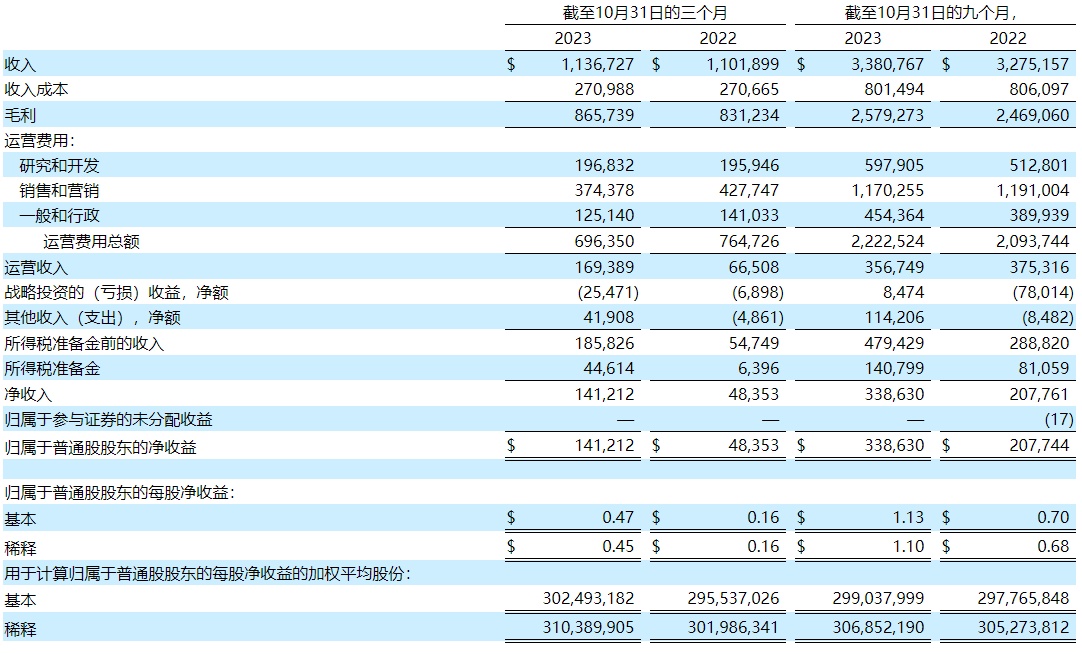 在本季度中,zoom 实现运营利润 1.69 亿美元,上年同期为 6651 万美元,同比增长 154%。对于非公认会计准则下的表现,三季度运营利润为 4.47 亿美元,上年同期为为 3.81 亿美元,实现同比增长 17%。