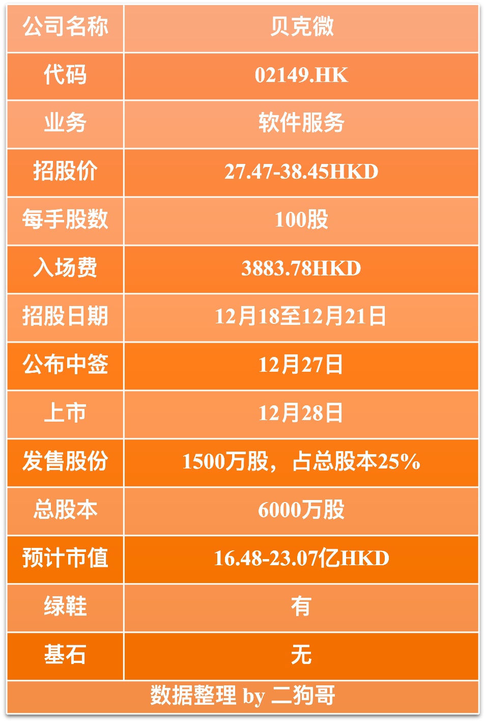 6、从操作来看,公司本次发行 1500 万股,没有基石投资者,按照招股价中间价 32.96 港元计,流通盘为 4.9 亿港元,公司市值不大,流通盘倒是不小,操作起来还是很困难的。不过二狗哥比较看好公司所处的行业,以及公司这几年的增速着实惊人,二狗哥还是要参与一下,争取搞个年底红包好回家过年。