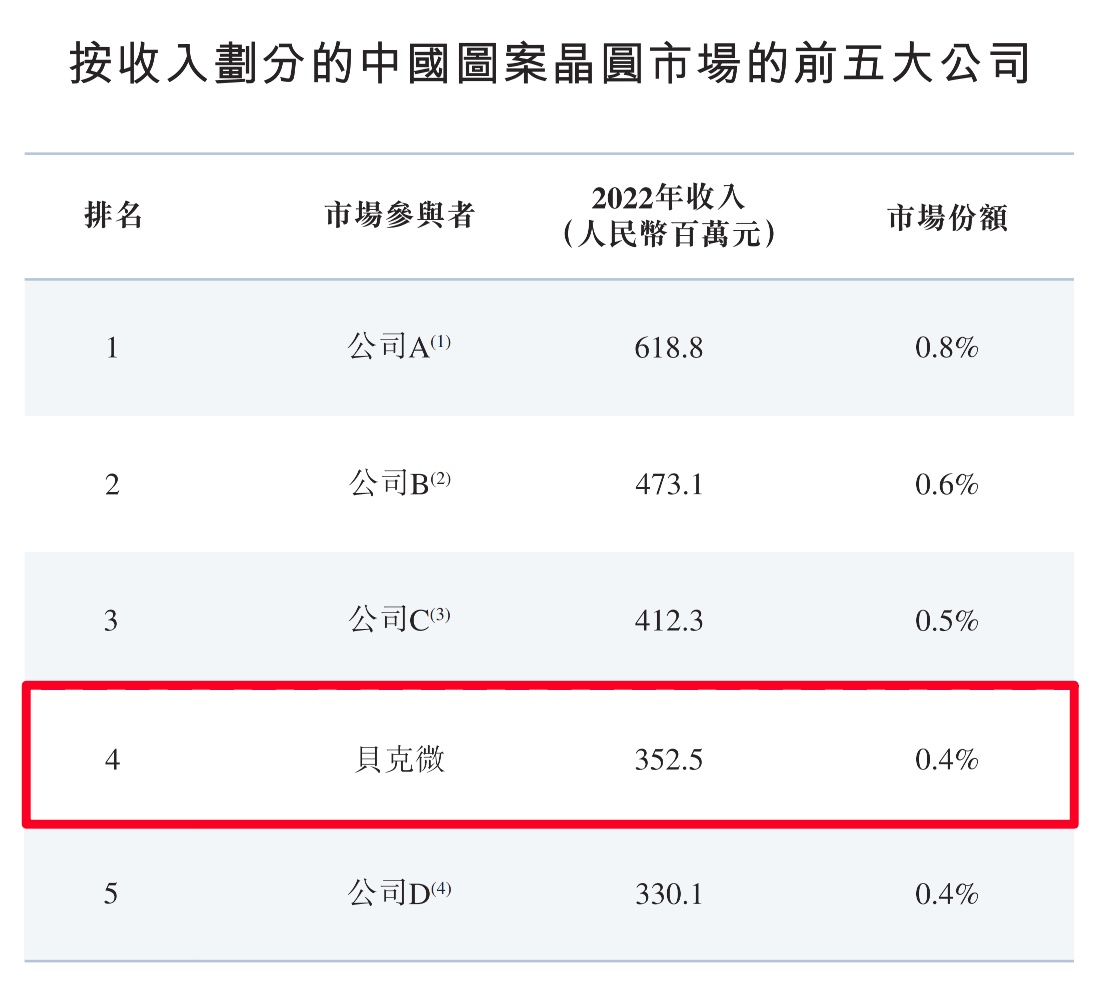 国内图案晶圆市场高度分散,按照 2022 年营收计,公司在国内图案晶圆市场排名第四,其市场份额为 0.4%,即使排名第一的公司市场份额也仅为 0.8%,前五大市场参与者市场份额合计为 2.7%,由此可见,目前图案晶圆市场尚无出现龙头企业,呈现出百花齐放的局面,这对于公司来说,一旦登陆资本市场,将来会有更大的发展机遇。