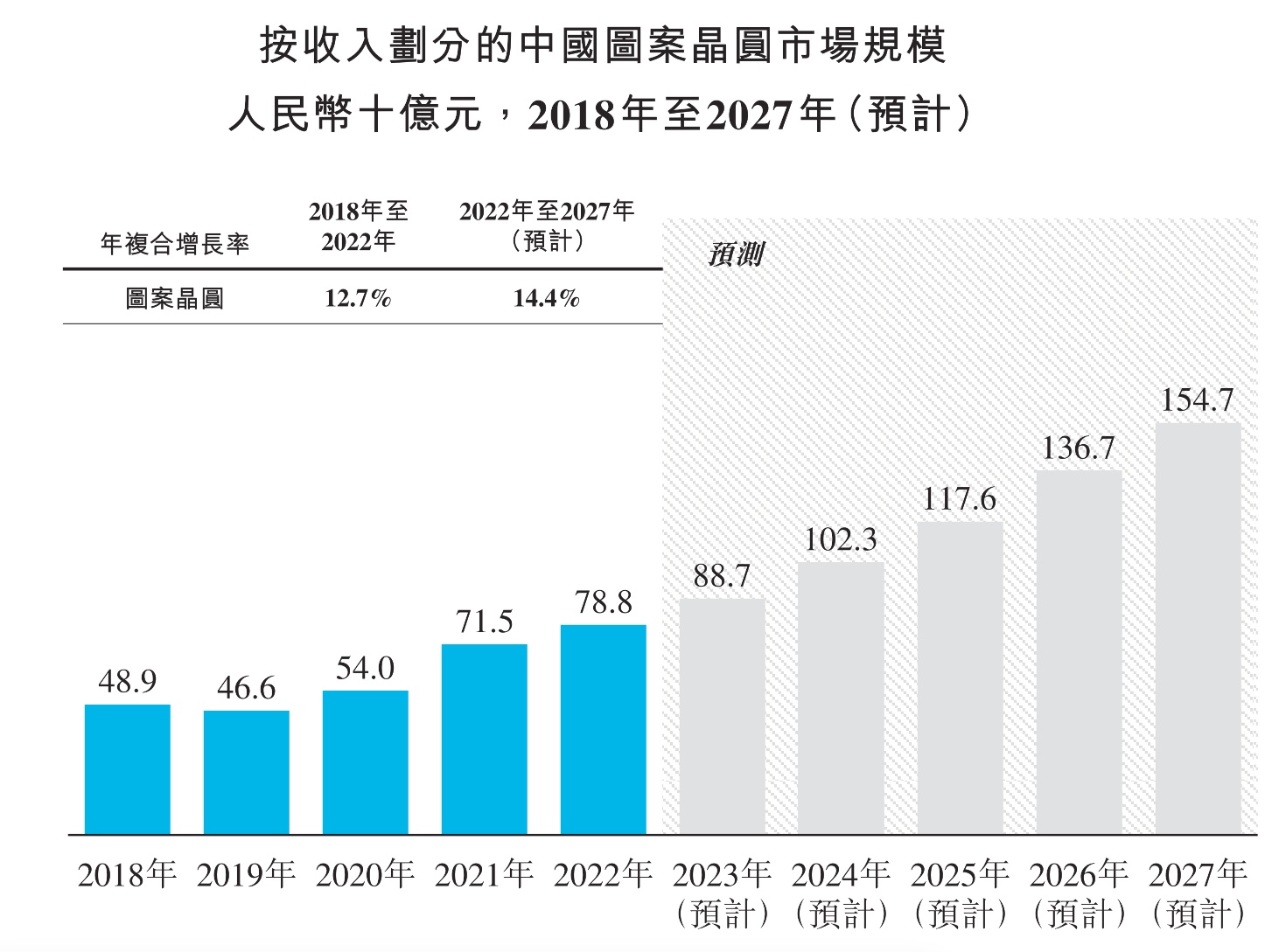 得益于巨大的市场需求和李好的行业政策,国内图案晶圆市场已经成为一种新兴趋势,其市场规模由 2018 年的 489 亿元增至 2022 年的 788 亿元,期间年复合增长率为 12.7%,预计到 2027 年市场规模将达到 1547 亿元,2022 年至 2027 年年复合增长率为 14.4%。总的来说,公司所处的行业发展前景还是很不错的。