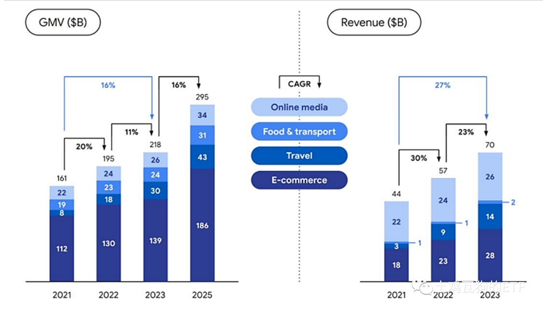6、数字经济:根据东南亚数字经济报告,从 2023 年-2025 年各国数字经济 GMV 复合年均增长率来看,位居前三的国家分别为越南、菲律宾和泰国。其中,越南和菲律宾以 20% 的增速高居榜首,越南数字经济 GMV 从 300 亿美元增长到 430 亿美元,菲律宾从 240 亿美元增长到 350 亿美元;紧随其后的泰国增速为 17%,数字经济 GMV 从 360 亿美元增长到 490 亿美元,同时体量位居东南亚第二。