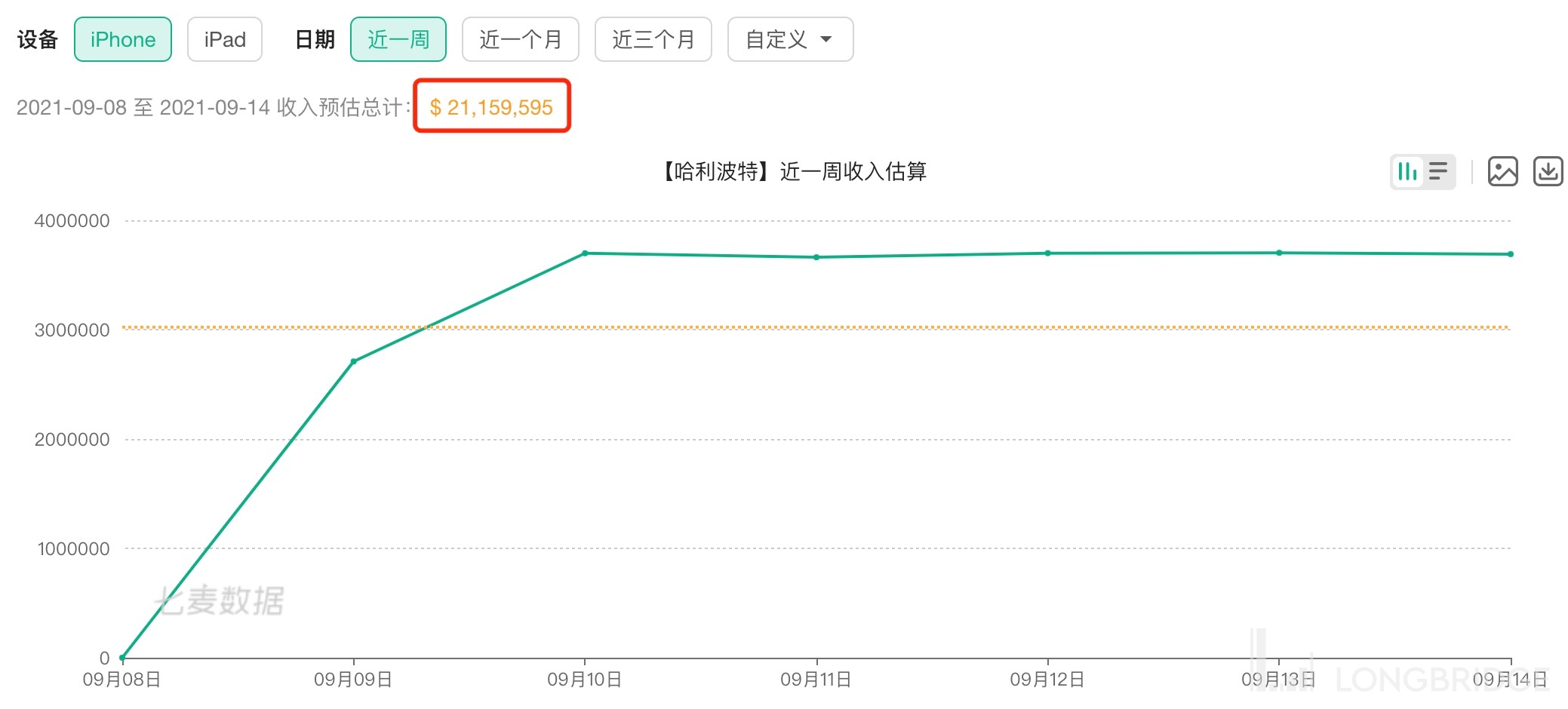 根据七麦数据预估,截至目前,《哈利波特》上线一周不到,iOS 端流水已经达到了 2116 万美元,约 1.38 亿人民币,如果按照 iOS:安卓=1:2 的流水关系,那么全平台中除了 PC 端没有第三方数据无法统计之外,移动端的流水累计超 4 亿元人民币,远远超出了海豚君原本预估的 9 月 2 亿。